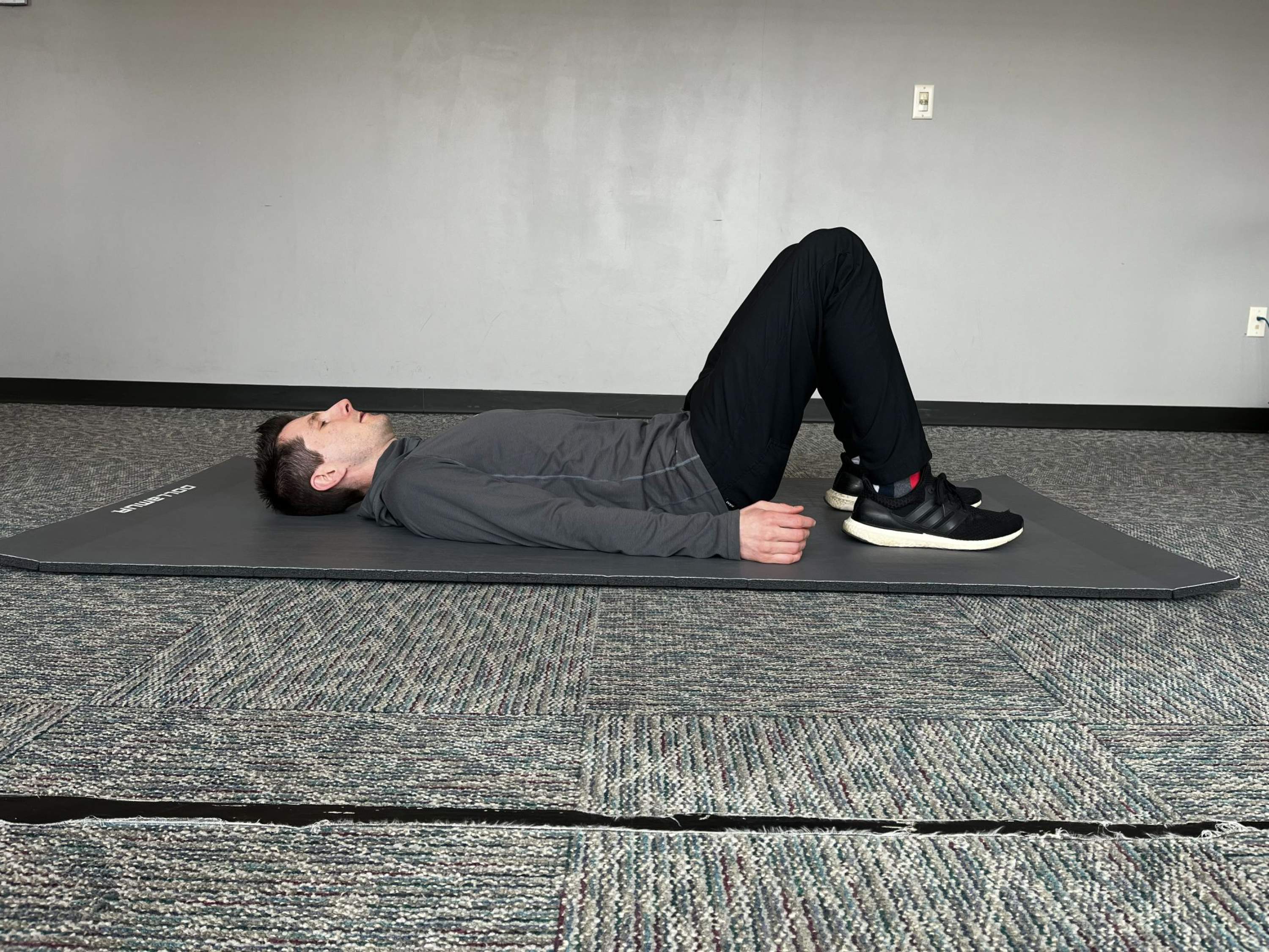 The Hip Bridge is a foundational movement that we love to use in our warm up and circuits. This is especially important for those who struggle to feel their glutes activate as it is a very safe position that works to isolate the glutes. To start, lay on the floor in a hook lying position, as shown below.