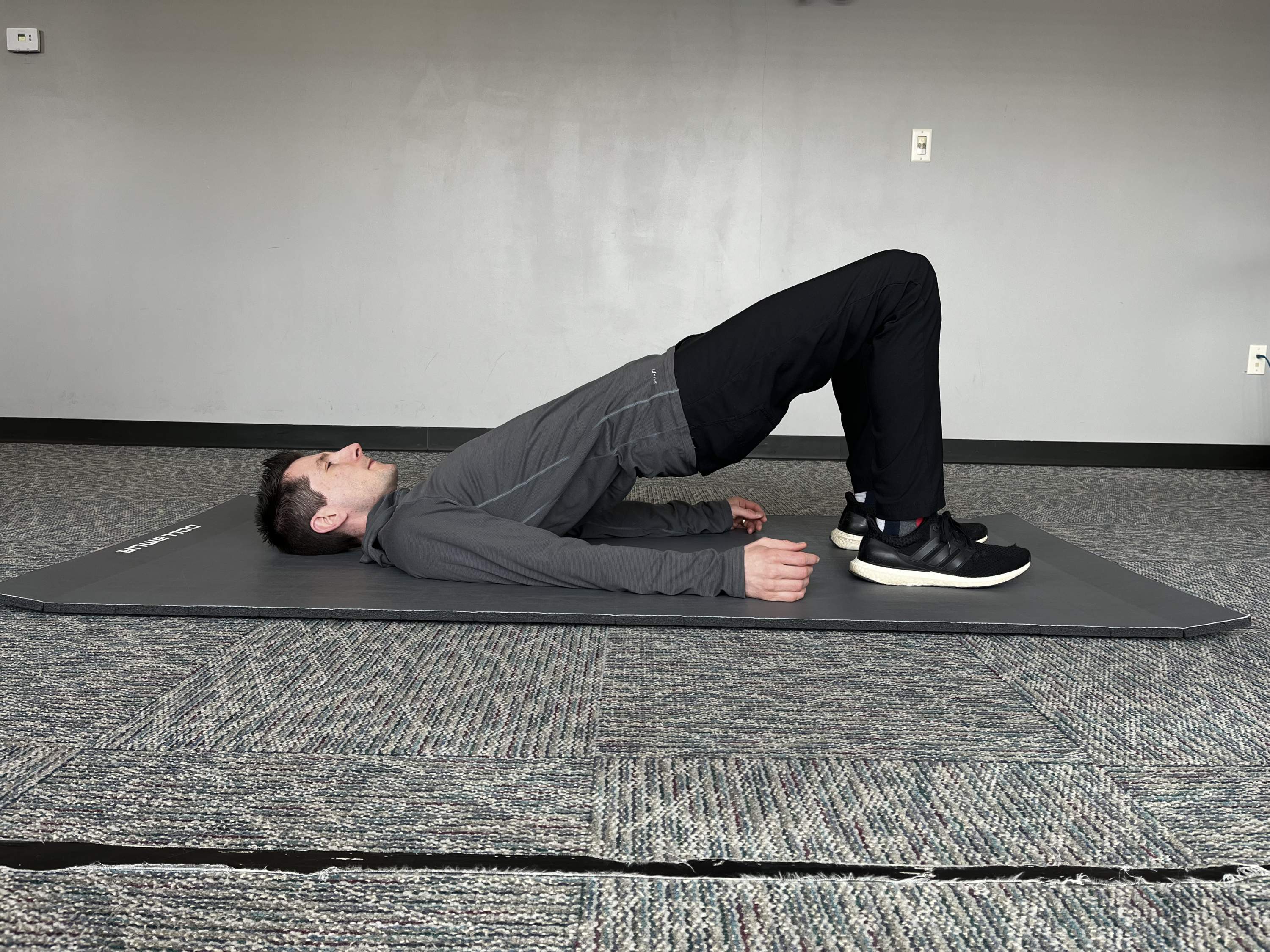 From there, brace the core, press the heels into the ground, and lift the hips up towards the cieling, stopping when the shoulders, hips, and knees create a straight line, as shown below.