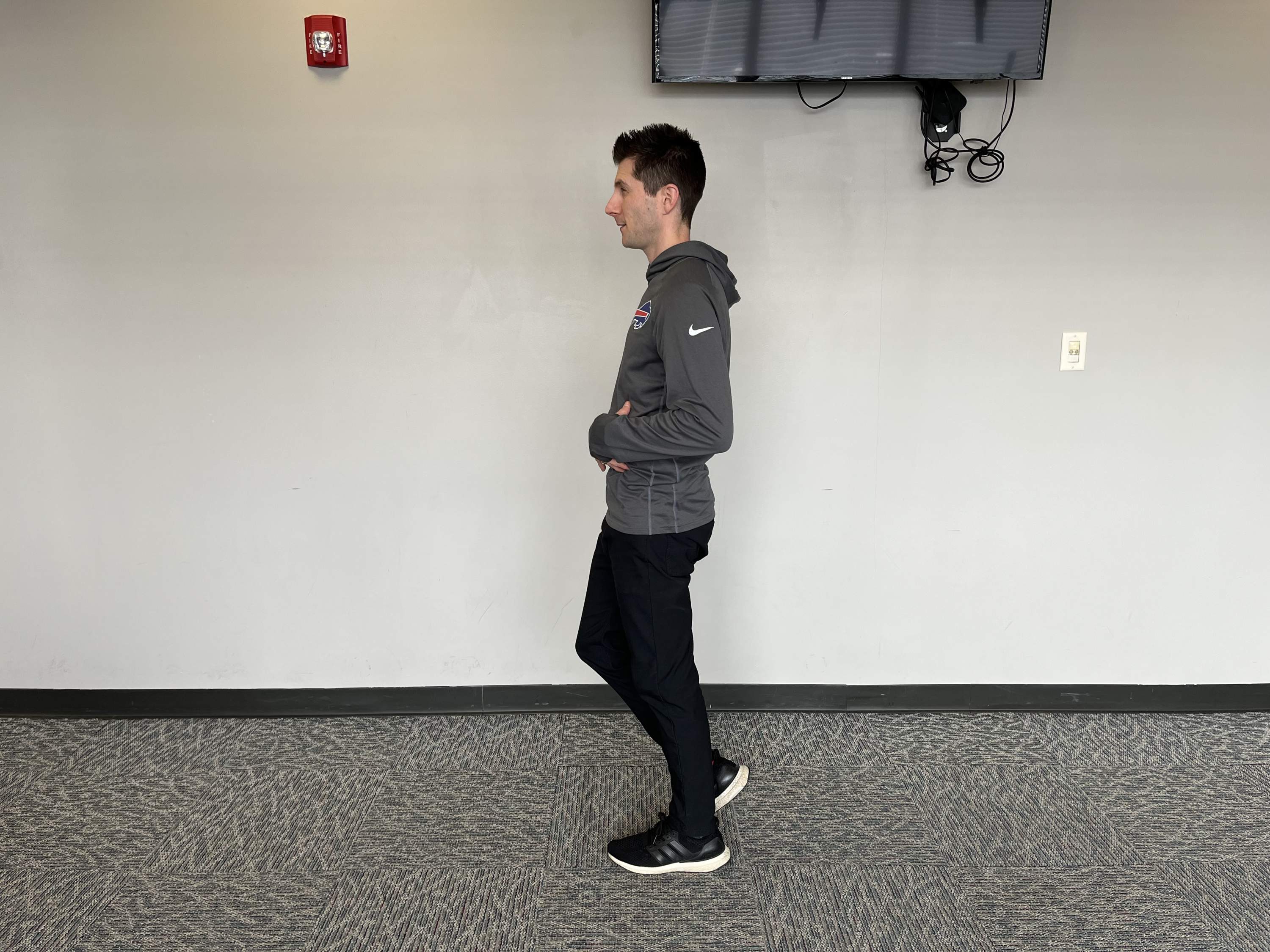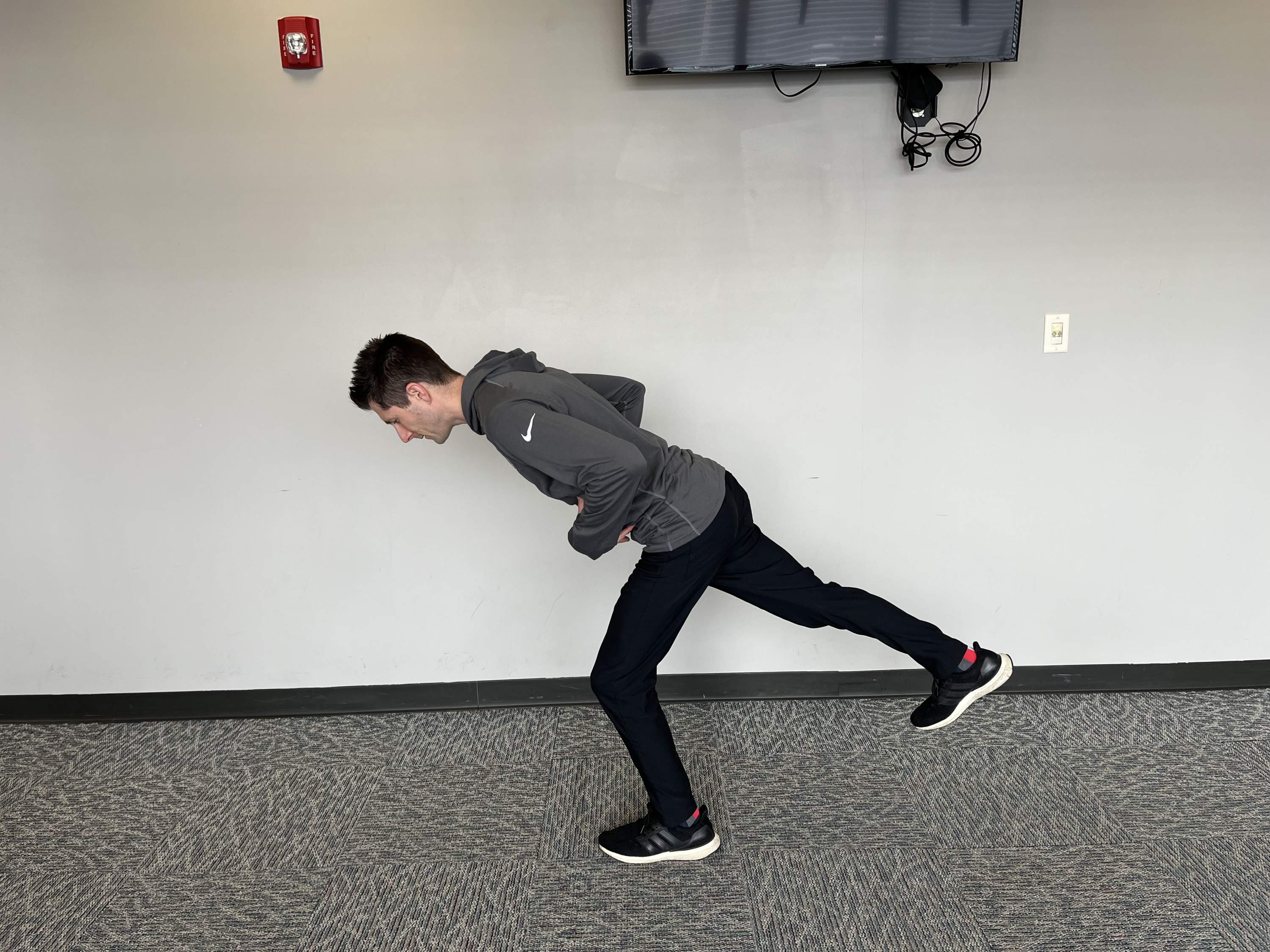 From here, reach the weightless foot towards the wall behind you, moving through the hip. From there, focus on the glute as you press your hips forward, coming back to a standing position.