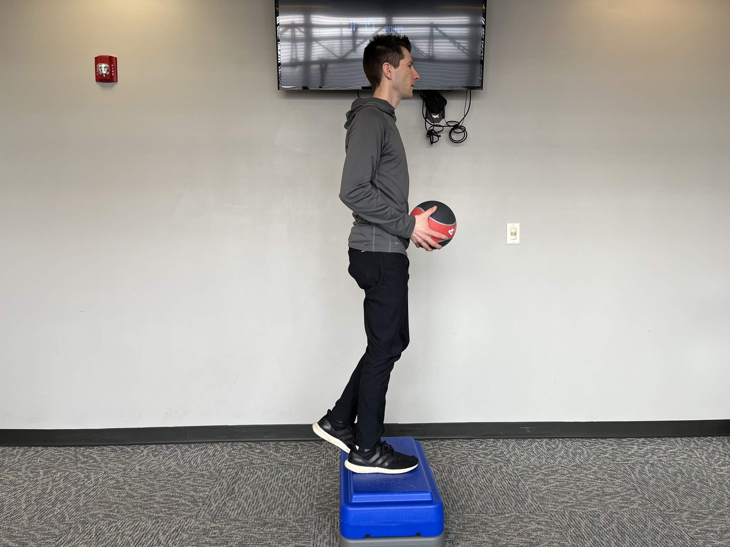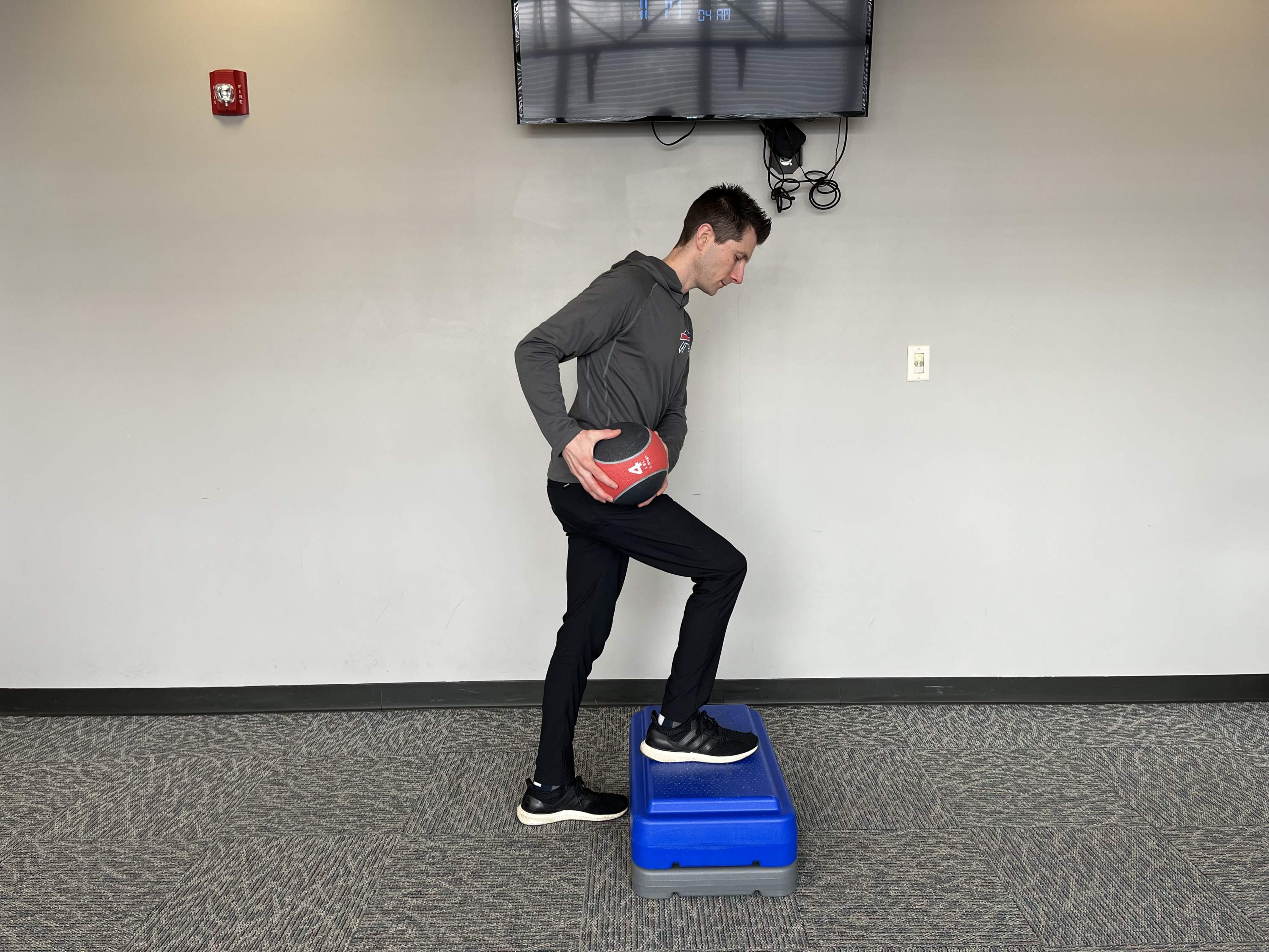 From there, press the foot into the step, and drive through the hips to reach a standing position. Slowly bring the foot back to the ground, being sure to feel the glutes the entire way down. Bring a medicine ball towards the hip of the elevated leg to help fire the glute.